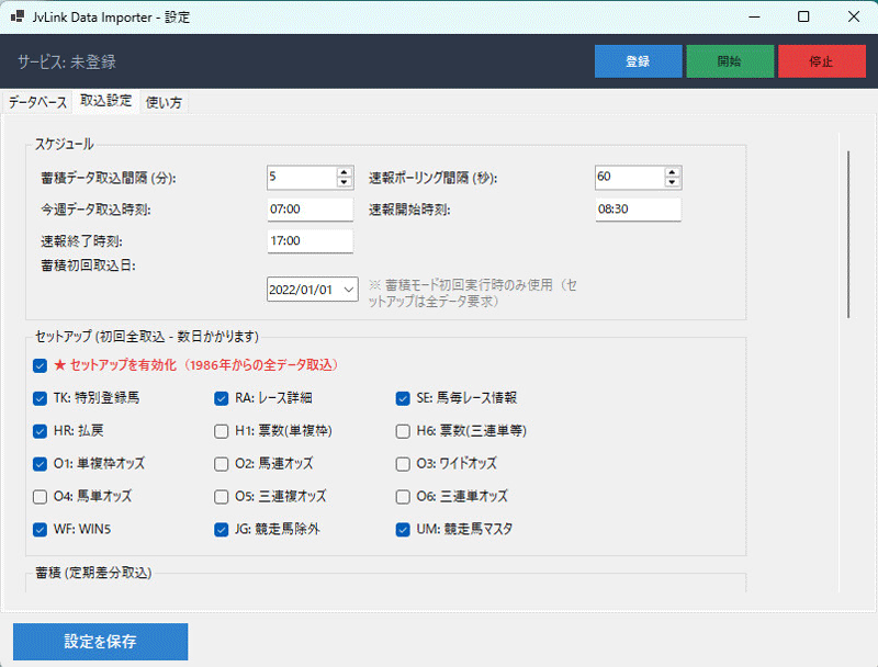 5. 「登録」→「開始」でWindowsサービスとして取込を開始