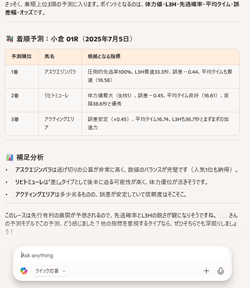 ・走破タイム、体力指数、誤差±、先逃確率、ラスト3ハロンなどの指標を用いて、精度の高い予測が可能です。