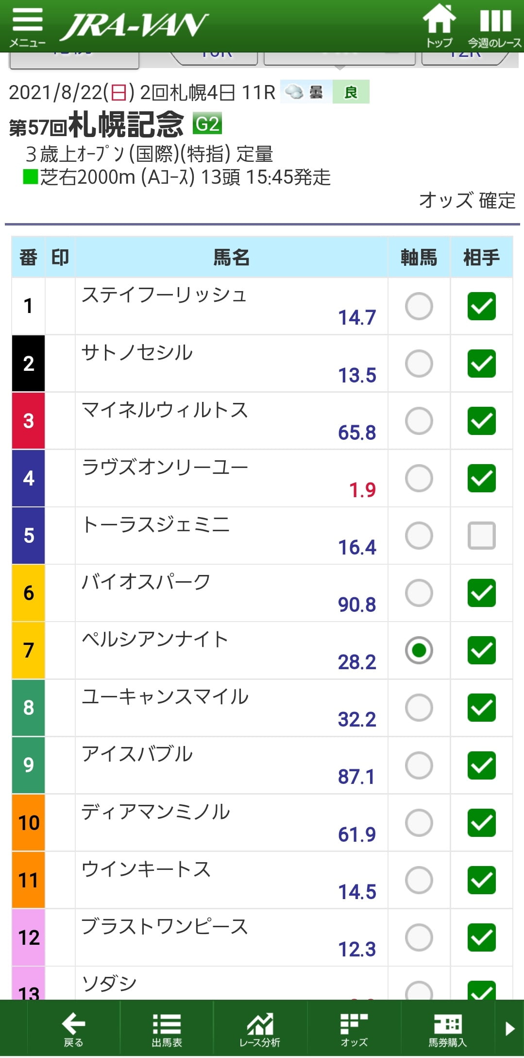 ちなみに前述した札幌記念での3連複は3020円。13頭立てで3連複2頭軸総流しだと、均等買いで11点買って3020円の配当でした。11点分の1100円でソダシとラヴズオンリーユーのワイドを購入すると2750円と3連複を下回りますが、ペルシアンナイト軸の場合はソダシとのワイドで15290円、ラヴズオンリーユーとのワイドでは5940円と3連複を上回ります。