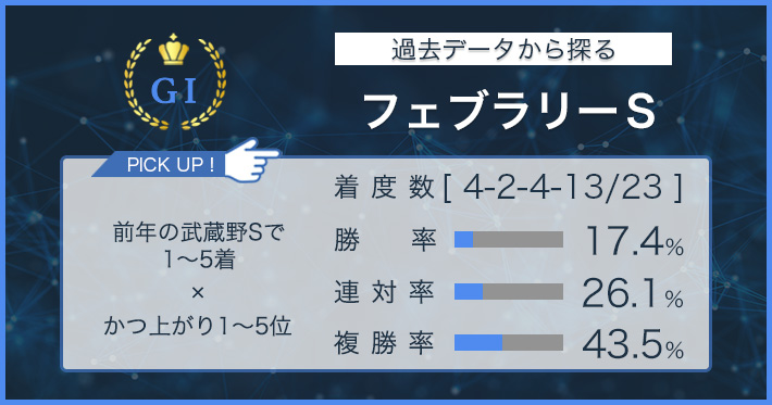 前走プロキオンS組のデータは、24年までの東海Sを準用する。この場合、前走1着ならフェブラリーSで複勝率50.0%を誇る一方、2着以下だと複勝率14.3%にダウン。また、全3勝を前走4角1〜3番手だった馬が挙げ、4番手以降だった馬は数値を落とす。両方を満たす「前走プロキオンSで4角1〜3番手から1着」だった馬の成績は【2.0.1.2】となる。