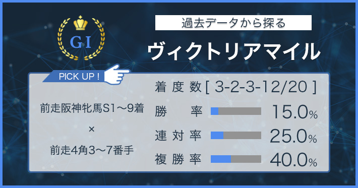 今年のヴィクトリアマイルには23頭がエントリー。「前走同距離」が10頭を数え、うち9頭の阪神牝馬S組が今年も最大勢力となる。このうち、データ的な有望馬「前走阪神牝馬Sで4角3〜7番手から1〜9着」に合致するのはアルジーヌ、ビヨンドザヴァレー、ソーダズリング。ほかにタガノエルピーダも当てはまるが、本校執筆時点では除外対象となっている。