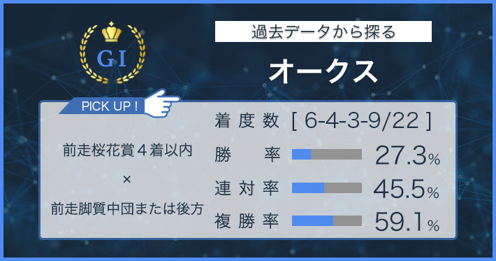 また、表5の11頭中9頭はオークス前までの成績が勝率40.0%以上、連対率50.0%以上、3着内率66.7%以上だった。これに該当しないユーバーレーベンは【1.1.3.1】で3着内率83.3%、ハギノピリナは【2.0.0.2】で勝率・連対率50.0%と、少なくとも1項目はクリアしていないと狙えない。