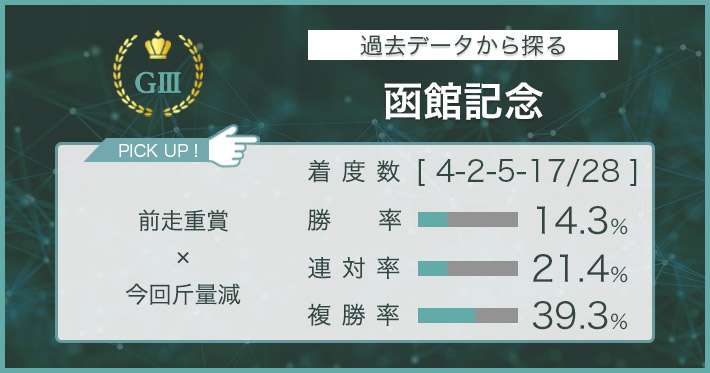 それに対し、前走ローカル組は複勝率12.4%と差をつけられている。出走数が多い前走函館組は昨年のホウオウビスケッツら2勝も、複勝率は11.7%とローカルの平均以下だった。