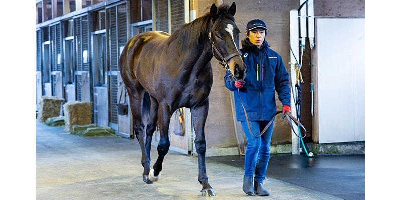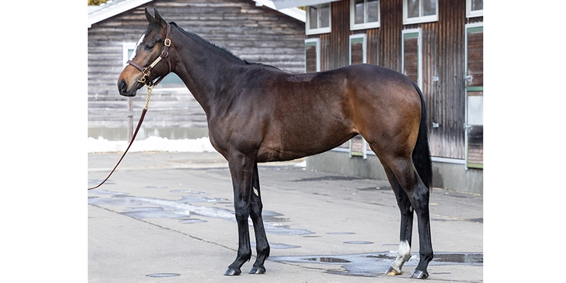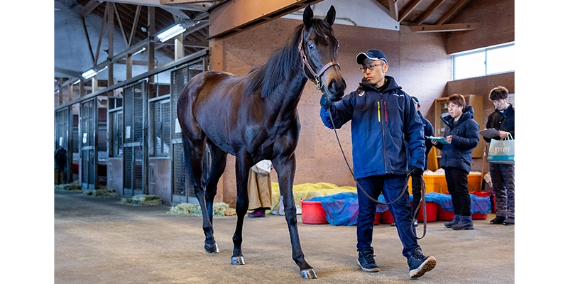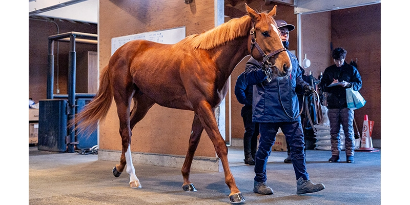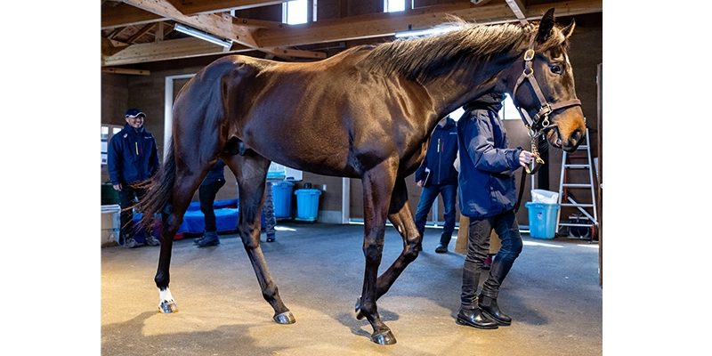 全体的にフレームが大きく、体を持て余している部分はありますが、それでもグングン進んでいくのは能力の証だと思っています。うちの厩舎で一番動いていて、3月上旬の移動、6月の新馬戦を目標に進めてきました。距離はマイルくらいが良さそうです。