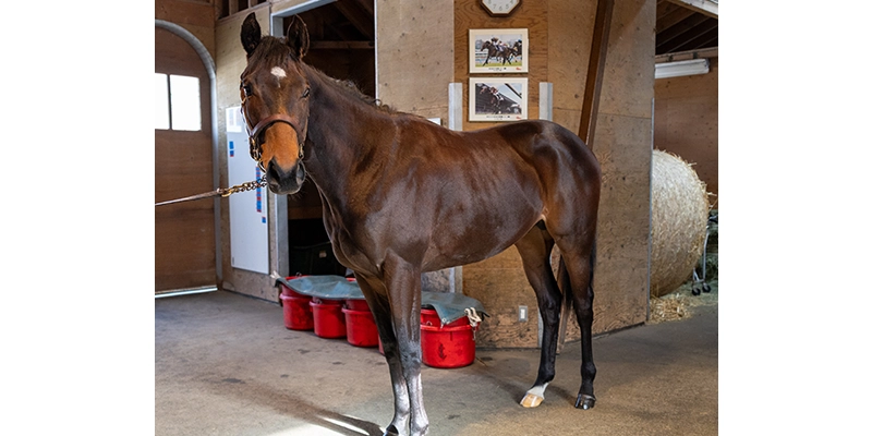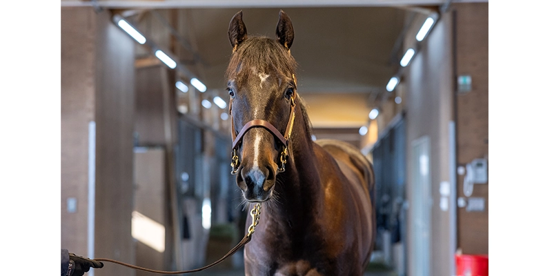 期待が高い1頭で、イヤリング厩舎にいる時から高い評価を受けていたと聞いていました。こちらに来て、実際に動きが良く、ポテンシャルの高い馬です。それでもまだ、成長の余地を残しているので、入厩の時期はしっかり見定めていければと思っています。フィジカル面でも恵まれています。