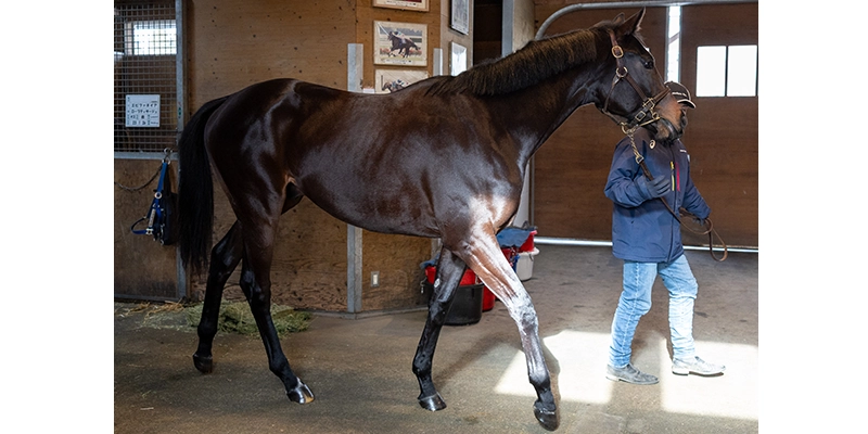 坂路3F44〜45秒台まで乗り進められています。体幹がしっかりとしていて完成度が高い1頭です。調教の負荷が上がっているので、脚元や背腰の疲れに気を遣いながら乗り込み量を調整してきました。距離は1600〜1800mあたりが良さそうです。持続力を生かした競馬が合いそうなイメージを持っています。6月の東京マイルでのデビューを目標にしています。