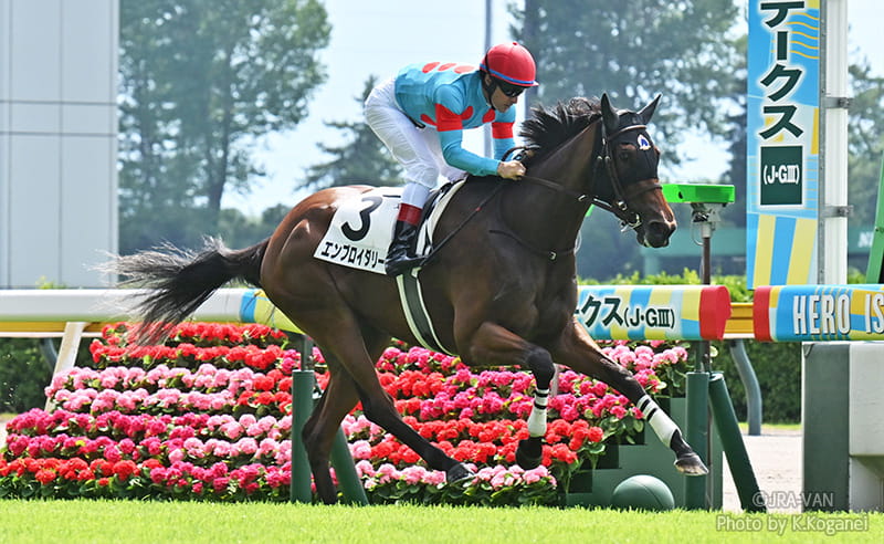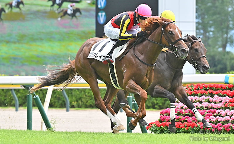 スタートは遅かったが、慌てずに中団よりも後ろで追走。直線では大外からじわじわと脚を伸ばすと、最後は内のダンケルドとの競り合いを3/4馬身制した。