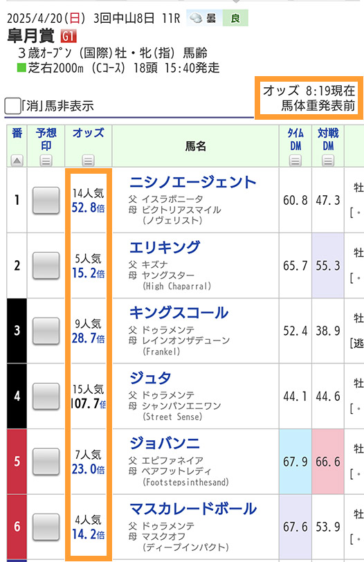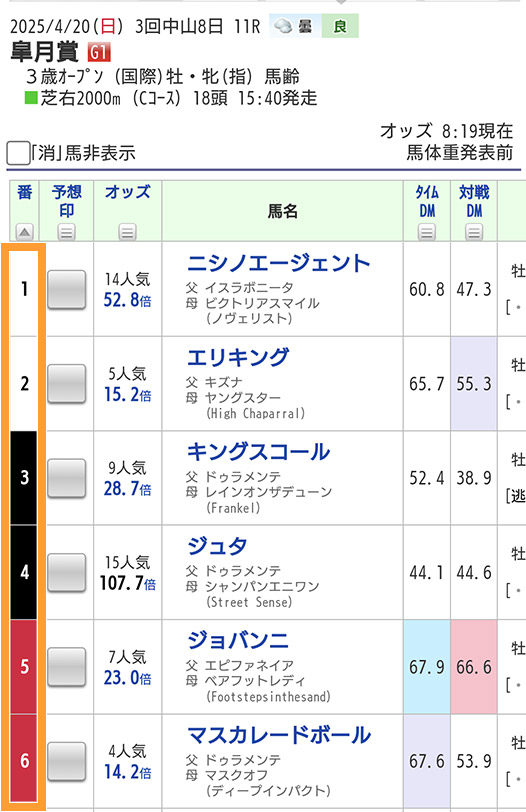 出馬表にはレースに出走する競走馬が枠番・馬番順に書かれています。左の数字が馬番・数字を、背景の色は白なら1枠、黒なら2枠というように枠番を表しています。