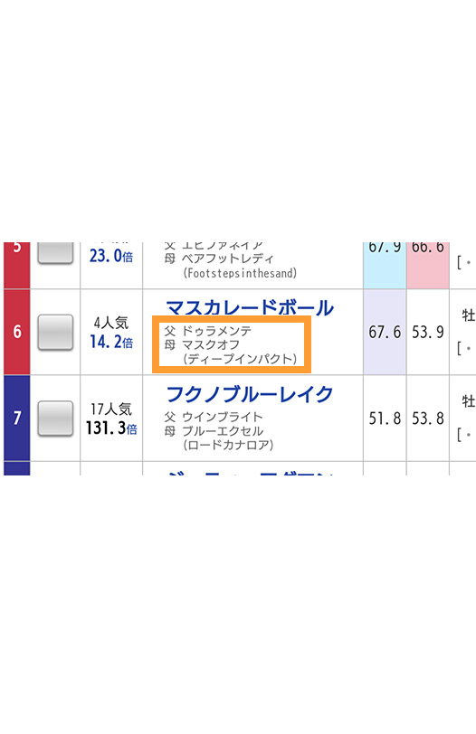 馬名の下に書かれているのはその馬の父馬名、母馬名、()の中は母の父です。