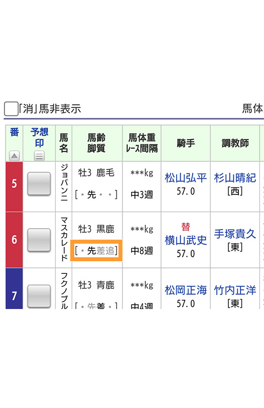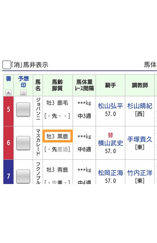 馬齢・脚質欄には左上に性別(牡/牝/せん)と馬齢が、右には毛色が書かれています。