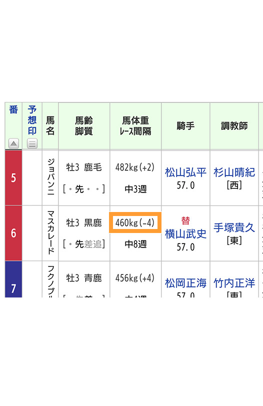 通常、レース発走の60分前に馬体重が発表されます。()内は前走からの増減です。