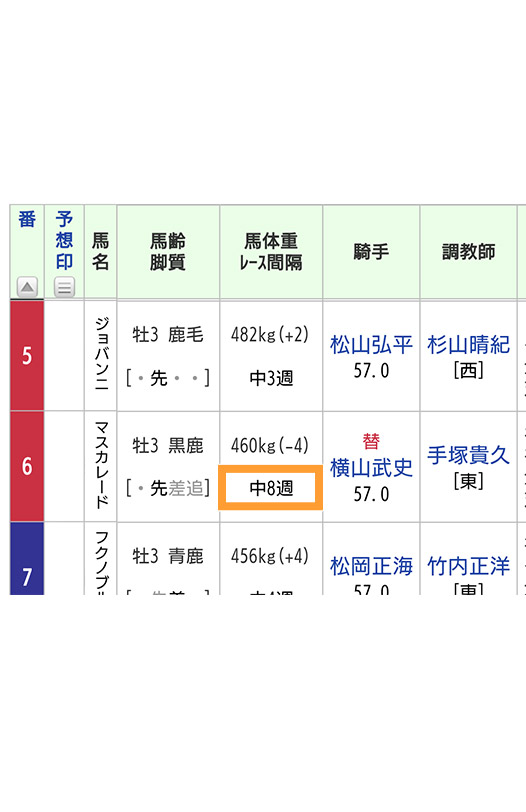2週続けての出走なら「連闘」、前走が先々週であれば「中1週」というように前走との間隔が表示されています。