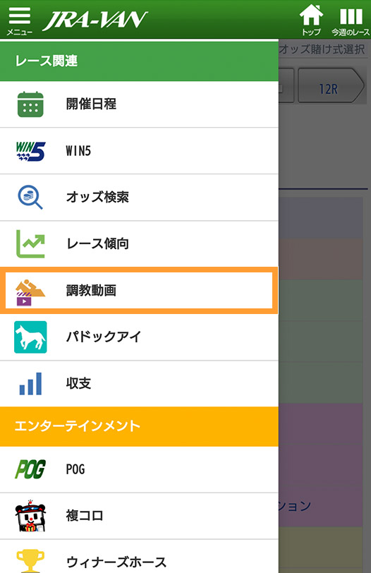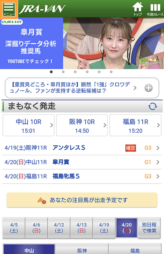 JRA-VANスマホアプリのトップページからメニューをタップ。
