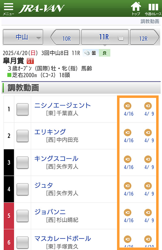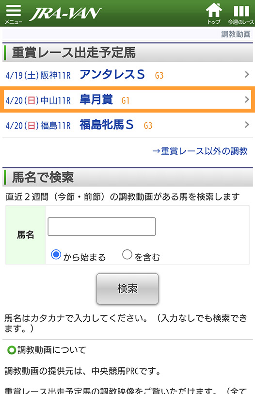 主に重賞レース出走予定の調教映像を見ることができます。レース名をタップしてみましょう。