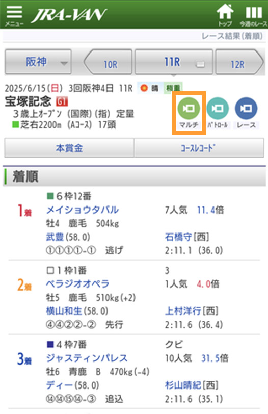 マルチカメラビューとは、通常のレース動画に加え、パトロールビデオ、競馬場のターフビジョンで放映している映像の3視点映像を提供しているコンテンツです。通常水曜15:30頃に前週分を配信します。