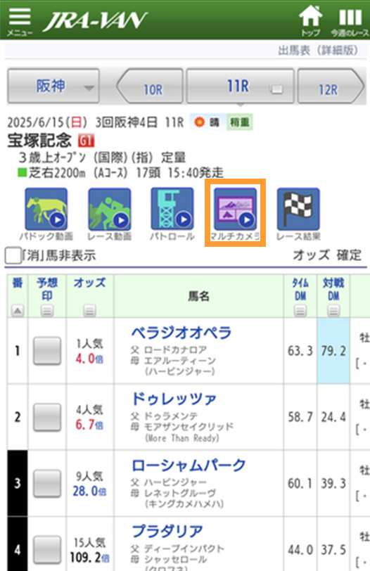 出馬表画面からもマルチカメラビューを再生できます。