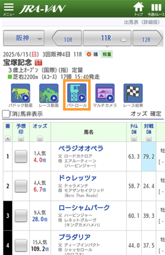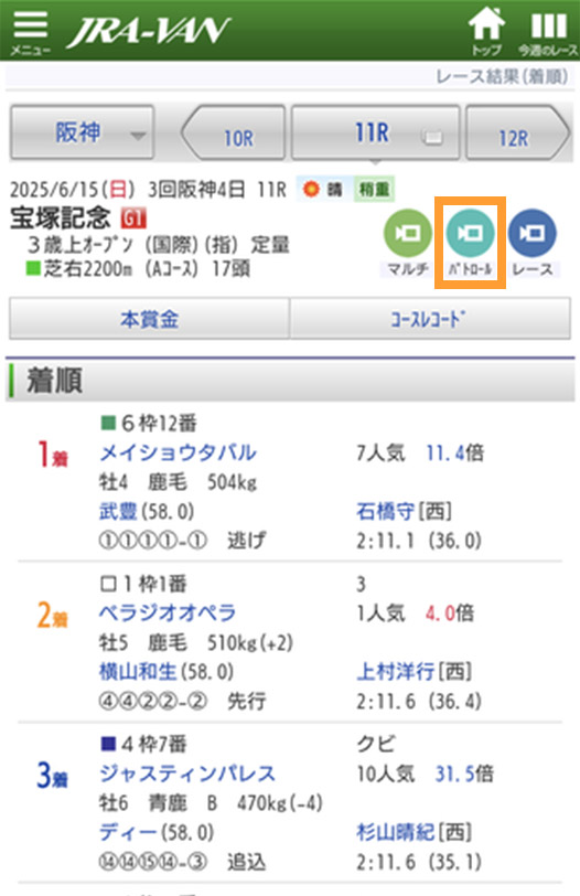 レース結果画面からもパトロールビデオを再生できます。