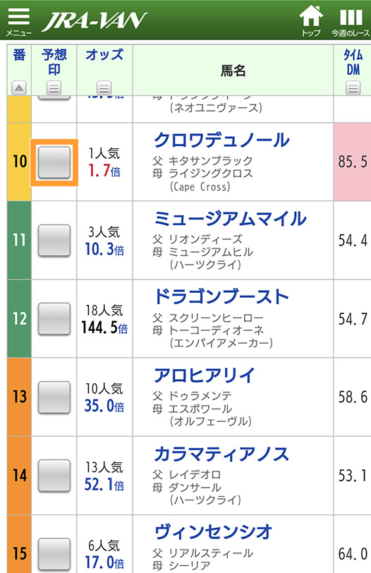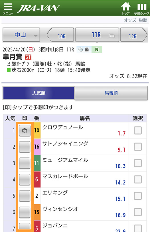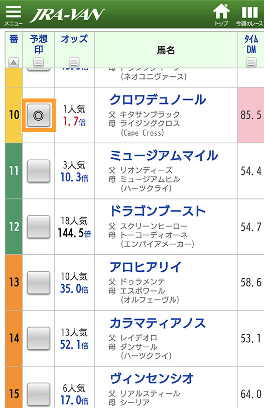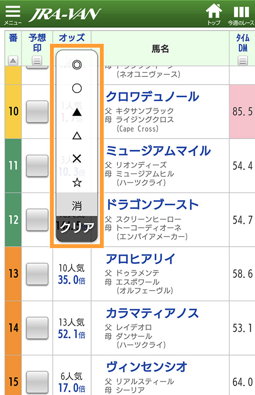 出馬表で馬名横の印欄をタップ。
