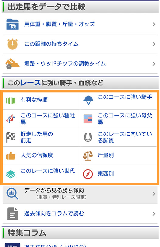 重賞レースでは、同じレースの過去10年分のデータについて、前走や母父、世代別の集計結果等を見ることができます。