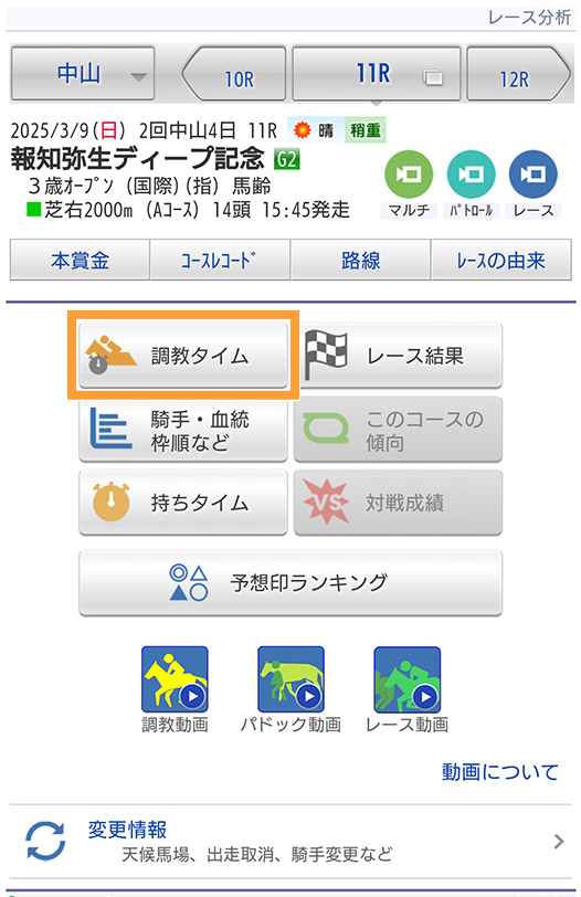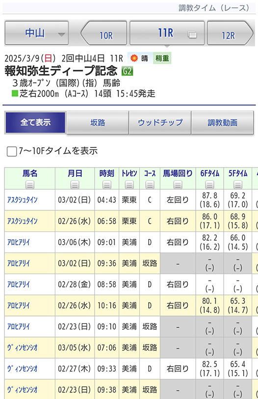 レース分析画面から「調教タイム」をタップすると、そのレースに出走する馬の調教データが表示されます。