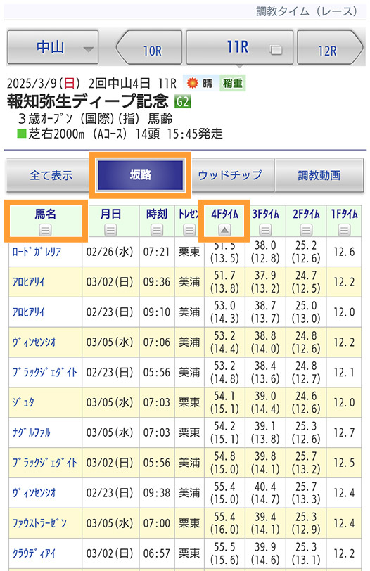 「坂路」をタップすると坂路調教のデータのみが表示されます。緑色の「馬名」「4Fタイム」をタップするとそれぞれの順に並び替えます。