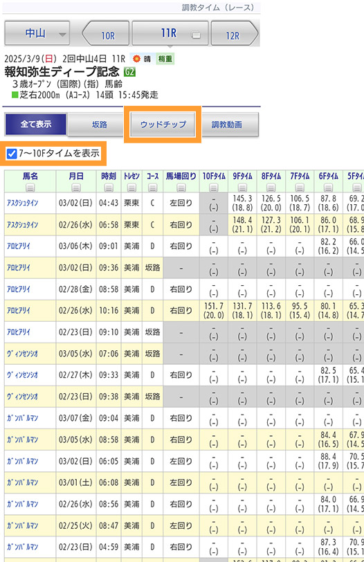 「ウッドチップ」ではウッドチップの調教データのみ表示します。「7〜10Fタイムを表示」にチェックを入れると列が追加されますが、計測区間は調教ごとに異なります。