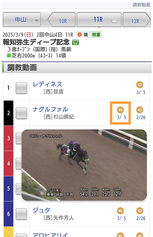 馬名右側のオレンジ色のボタンをタップすると調教動画が再生されます。