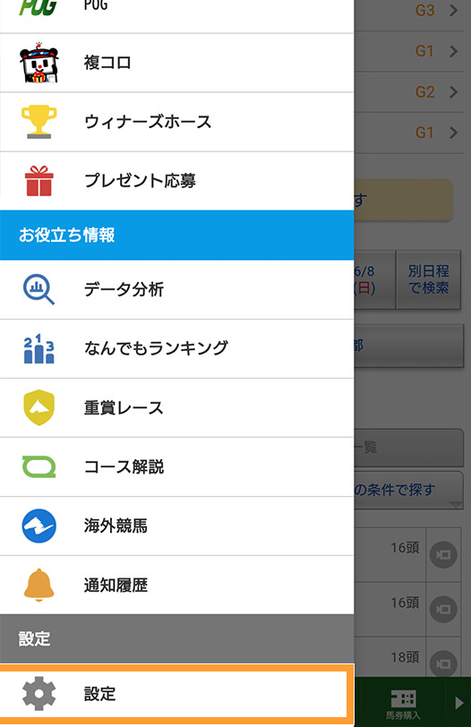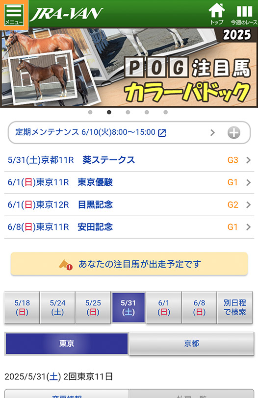 JRA-VANスマホアプリのトップページからメニューをタップ。