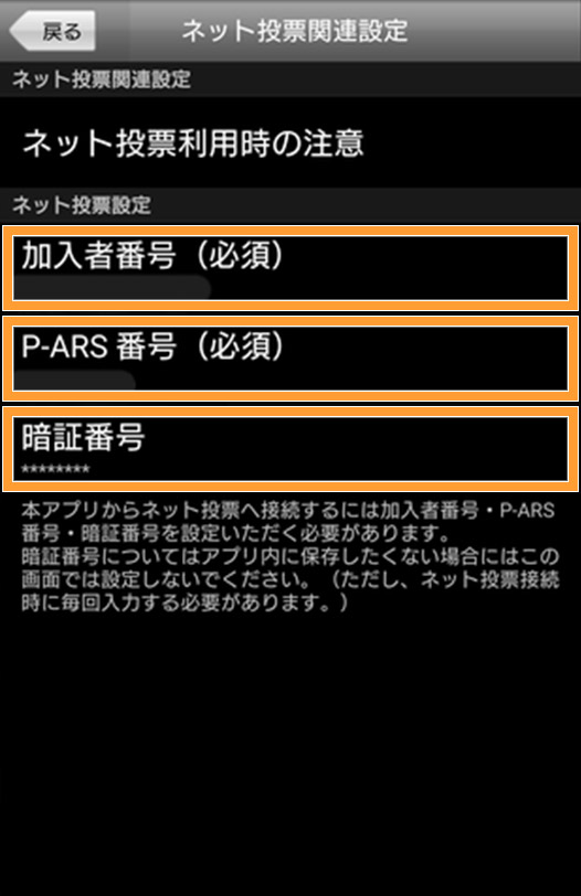 ご自身のネット投票の加入者番号・P-ARS番号・暗証番号を入力。これで設定完了です。