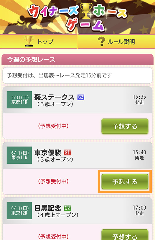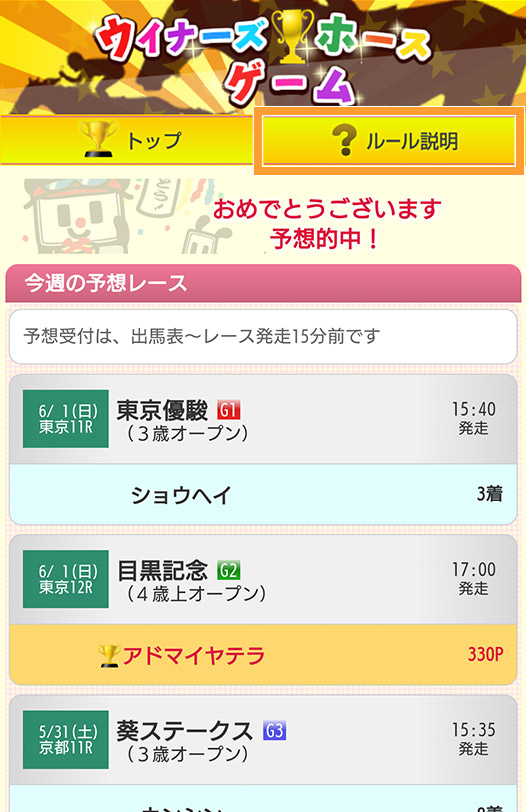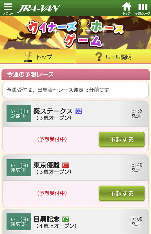ウィナーズホースゲームは、重賞レース(障害は除く)の勝ち馬を予想するゲームです。