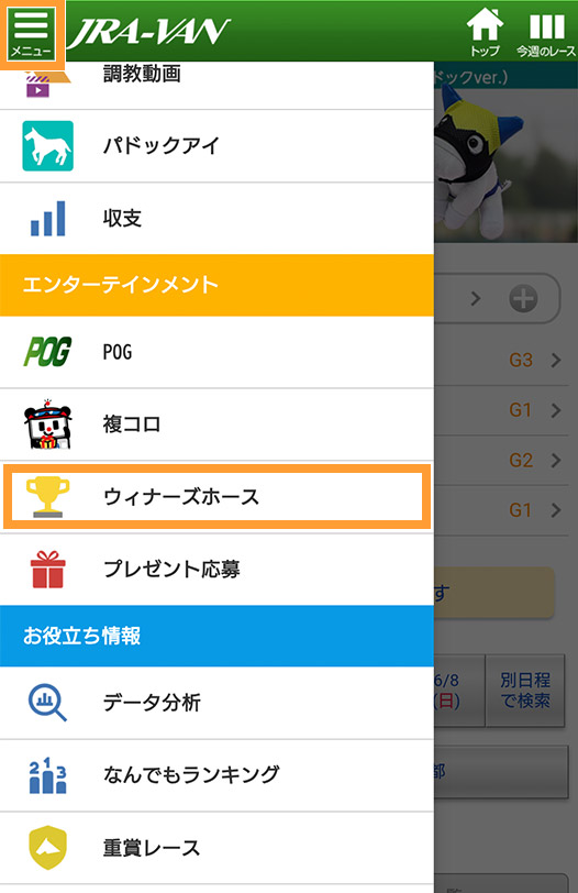 メニューをタップして下にスクロールして、ウィナーズホースをタップ。
