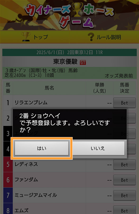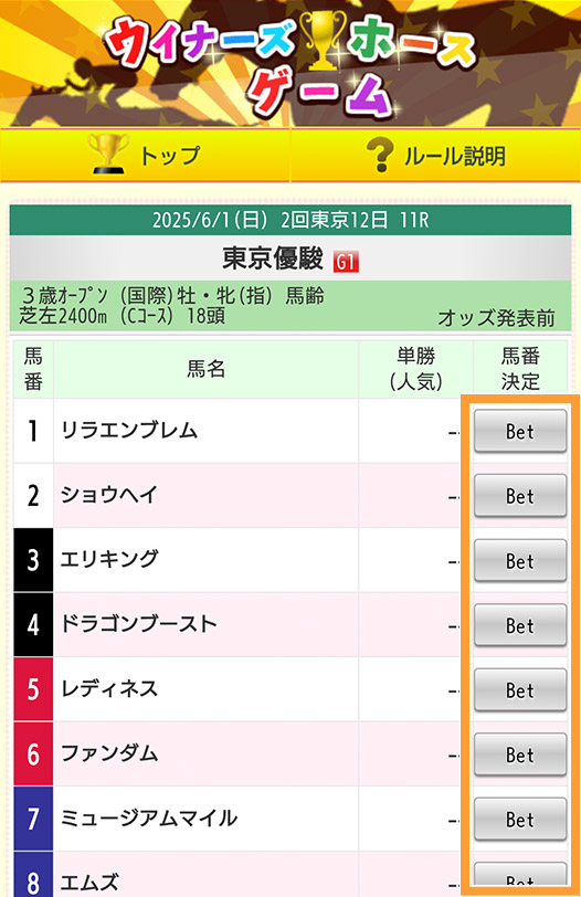 1着予想の馬を選んで「Bet」ボタンを押します。