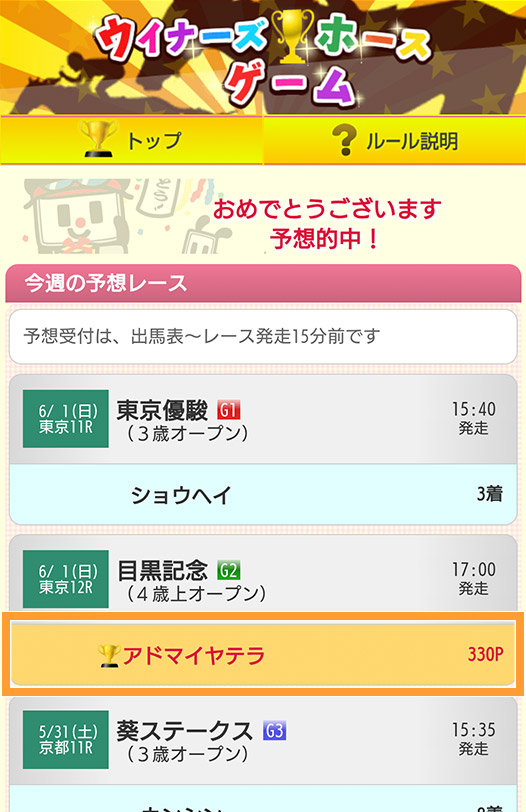 予想が的中すると単勝の払戻金に応じてポイントをゲットできます!