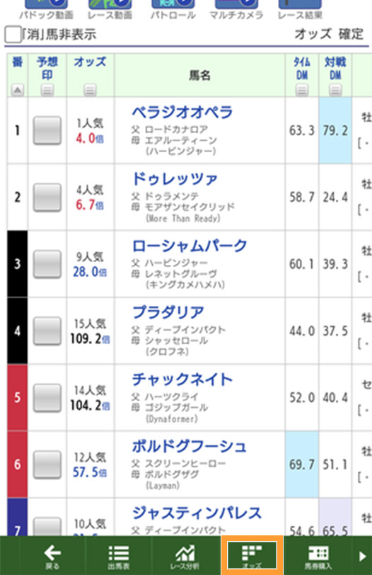 目当てのレースの出馬表をチェックしたらフッターの「オッズ」をタップ。