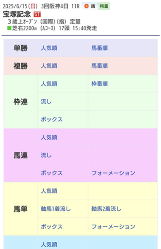 「単勝」「複勝」等、賭け式の一覧が表示されます。