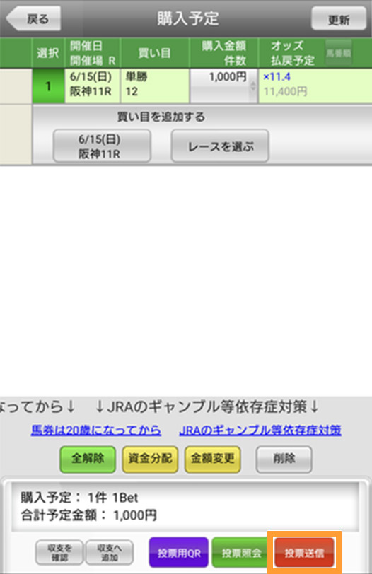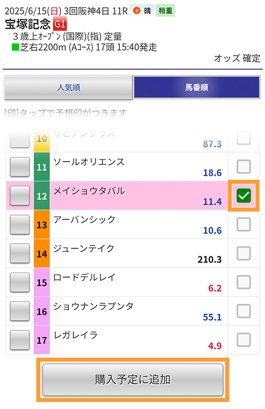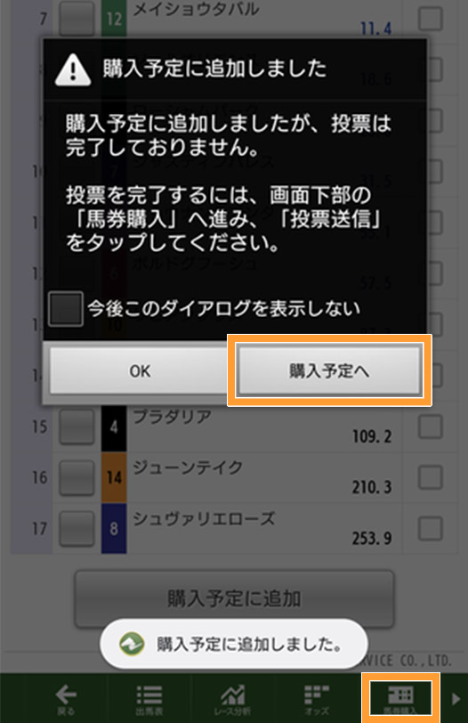 買い目にチェックを入れて、「購入予定に追加」をタップ。
