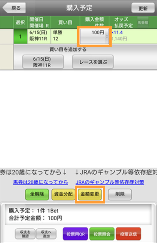 購入金額をタップ、または「金額変更」をタップすると賭ける金額を変更できます。