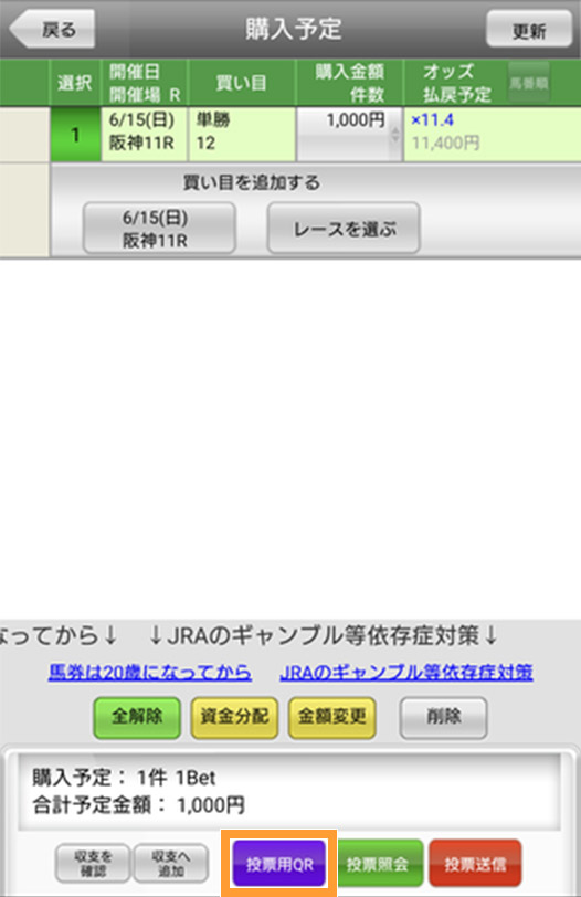 WINSや競馬場にいるときは「投票用QRボタン」でQRを作成して発売機にかざせばマークシート不要です。